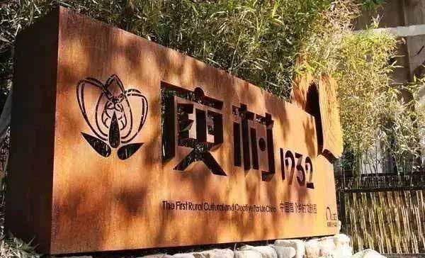 庾村,位于浙江德清縣莫干山的山腳下。村標(biāo)采用銹板雕刻,符合了工業(yè)時(shí)代復(fù)古的氣息,并融合了鄉(xiāng)村的元素。