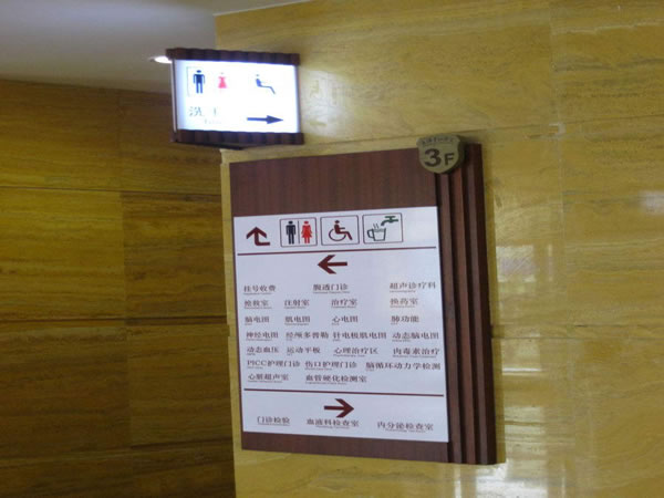 墻牌(立牌)需要平視,比較符合人的視覺習慣,是醫(yī)院出現較多的標牌形式。墻牌可大可小,關鍵是要把引導的部分寫清楚,相對于吊牌和地標,墻牌應該也具備詳細、完整的特性。針對不同區(qū)域,墻牌應在其完整性與指向性上做到遞進統(tǒng)一,即按層級設置,完成院、樓、層、區(qū)到具體科室的分級指引,設置醉佳路徑,以方便患者尋找。